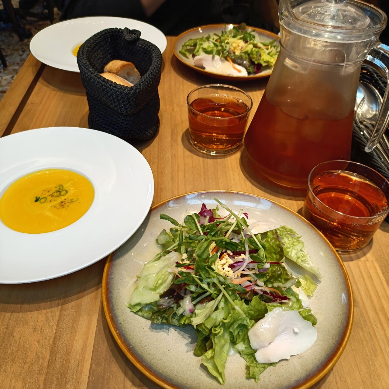 隣の人がサラダ食べてる時に早々とメイン来てたから、ヤバい!スープもサラダもあるのにメイン来たらテーブルに乗らないよ〜💦って焦って食べちゃいました😅