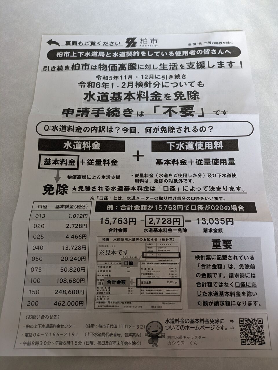 柏市上下水道局から今回も基本料金免除のお知らせが🎶