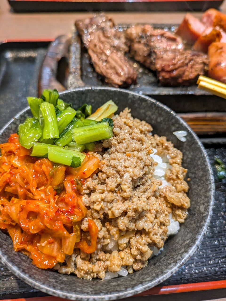 羽釜炊きのごはんに牛しぐれ・キムチ・野沢菜をたっぷりのせたら感動のニクコメ丼!!