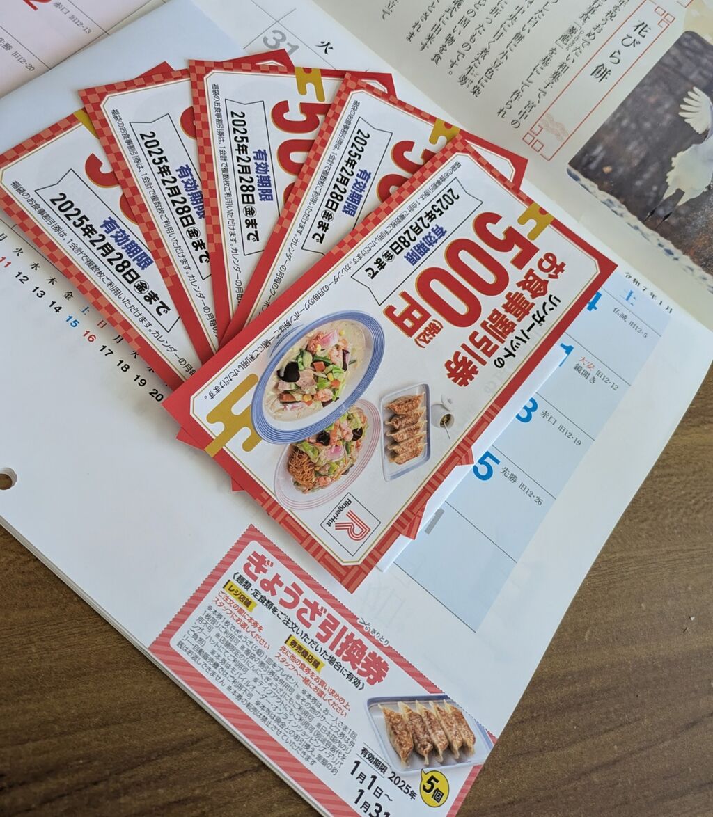 残念なのは、前回は100円引き券とぎょうざ引換券付きだったカレンダーが、今回はぎょうざ引換券だけになってしまいました😭