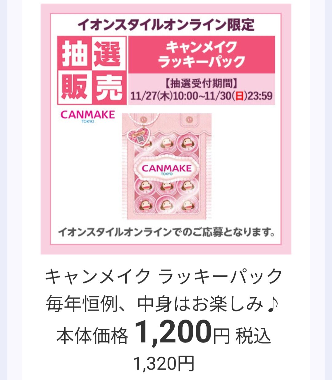お友達がキャンメイクとセザンヌの福袋がすごくお得だよ〜って教えてくれたんです。何気なくネット検索してたからかイオンスタイルオンラインからお知らせが来てましたよ〜