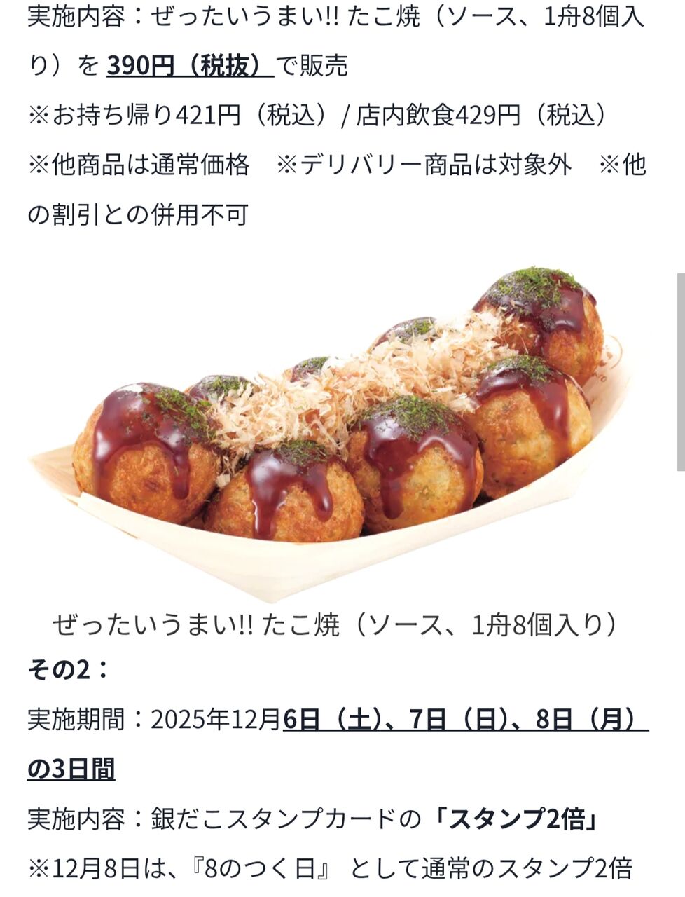2025年12月02日 銀だこ🐙390円サンキュー価格は明日から3日間! コメント数:0 コメント カテゴリ:お気に入りの食べ物 by tomohapiraki 銀だこの年末大感謝祭!!明日から始まりますよ〜🎶通常620円のたこ焼きが390円だからめちゃお得🉐買いに行かなくちゃ〜🐙 タグ :#銀だこ#年末大感謝祭#サンキュー価格