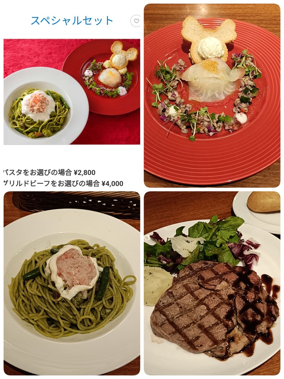 パスタ2800円、グリルドビーフ4000円、コーヒーは400円。