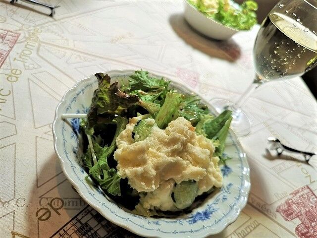 グリーンサラダにはポテサラもオン♪このポテサラは滑らかな舌触りで美味しい。