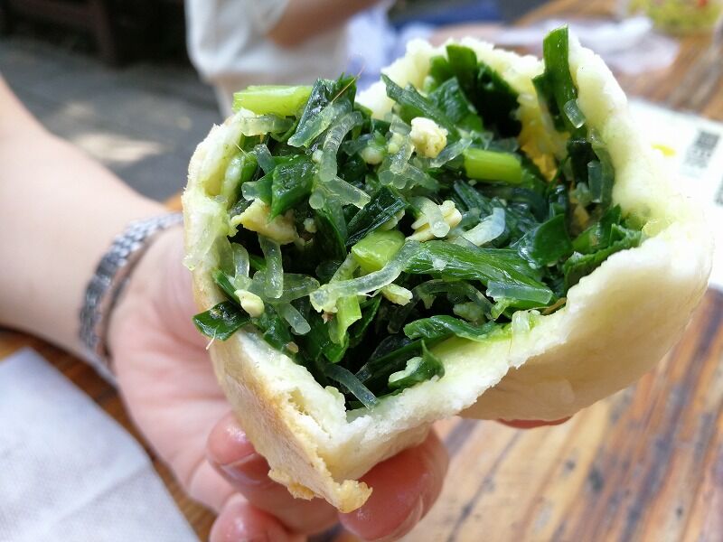 肉まんのようなふかふかの生地に、ニラ玉と豚肉がサンド!