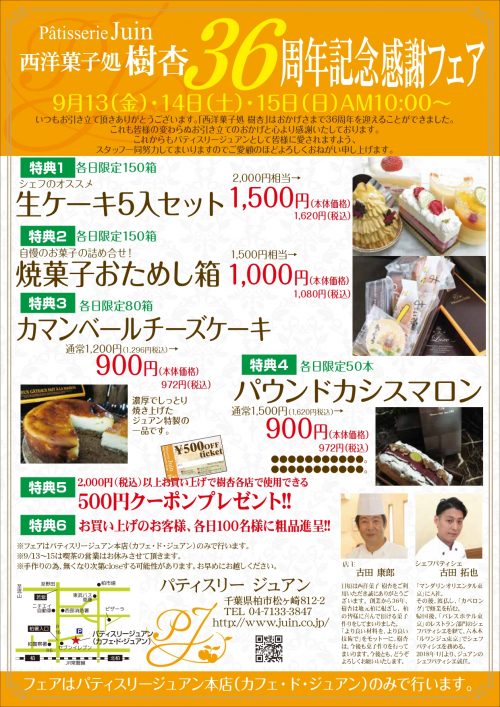 2019年09月12日 樹杏36周年記念感謝フェアは明日から3日間! コメント数:0 コメント カテゴリ:お気に入りの食べ物 by tomohapiraki 西洋菓子処 樹杏 36周年記念感謝フェアは明日から!樹杏本店(カフェ・ド・ジュアン)で開催されます。9/13㈮・14㈯・15㈰ 10:00~私も行きたかったけど~っっずっと仕事で行けないのが残念。。。行ける方はゼヒ! タグ :#樹杏#柏#ケーキ