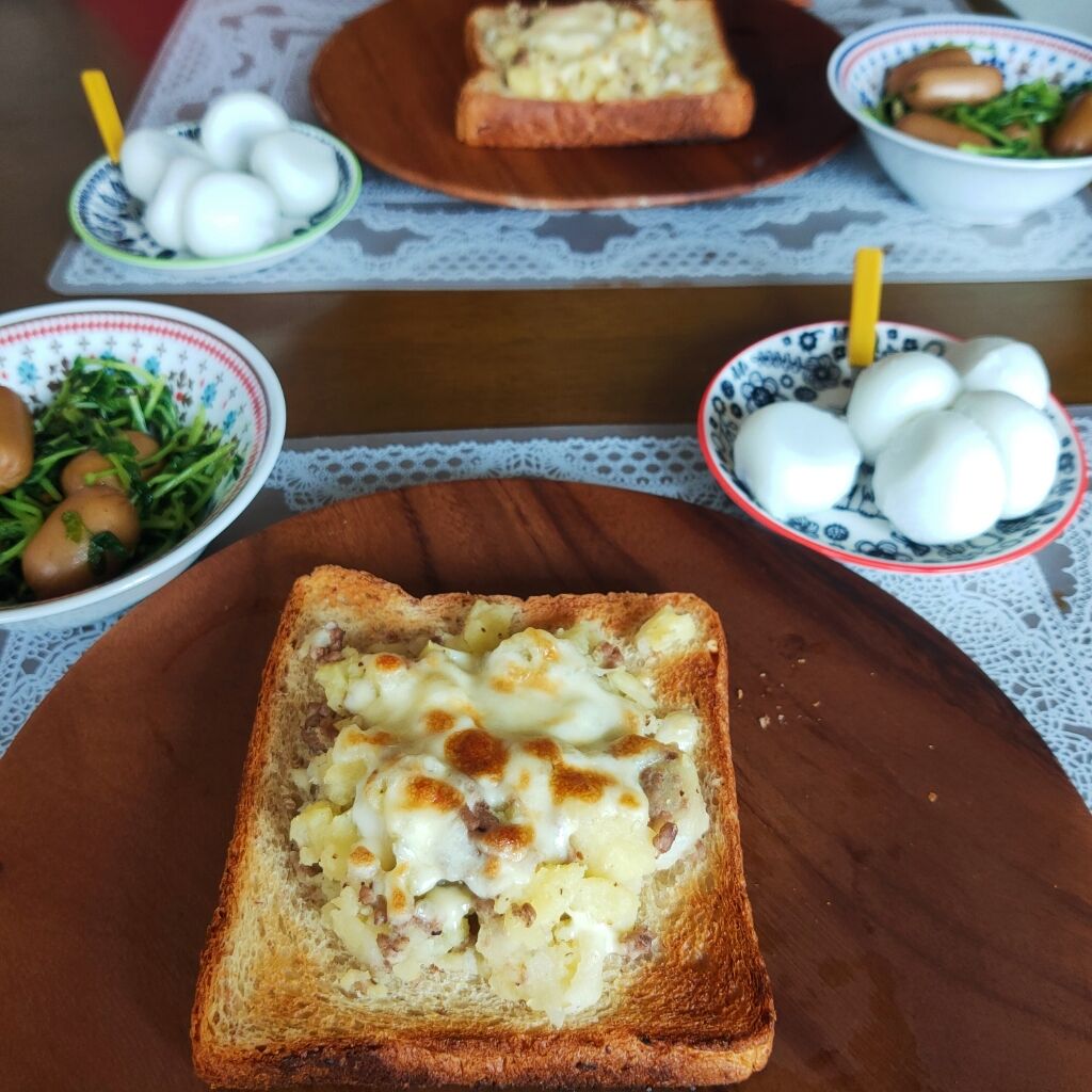 パンにコロッケの具ととろけるチーズをのっけてこんがり焼いて🎶