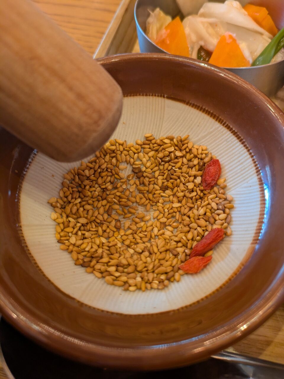 ごまをすりすりしてコムタンスープに入れて。やさしいスープですね。